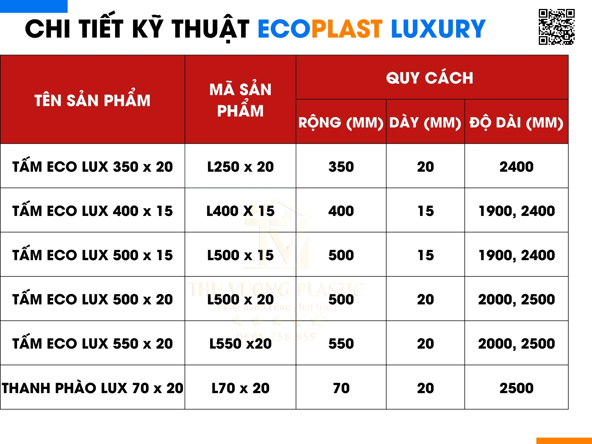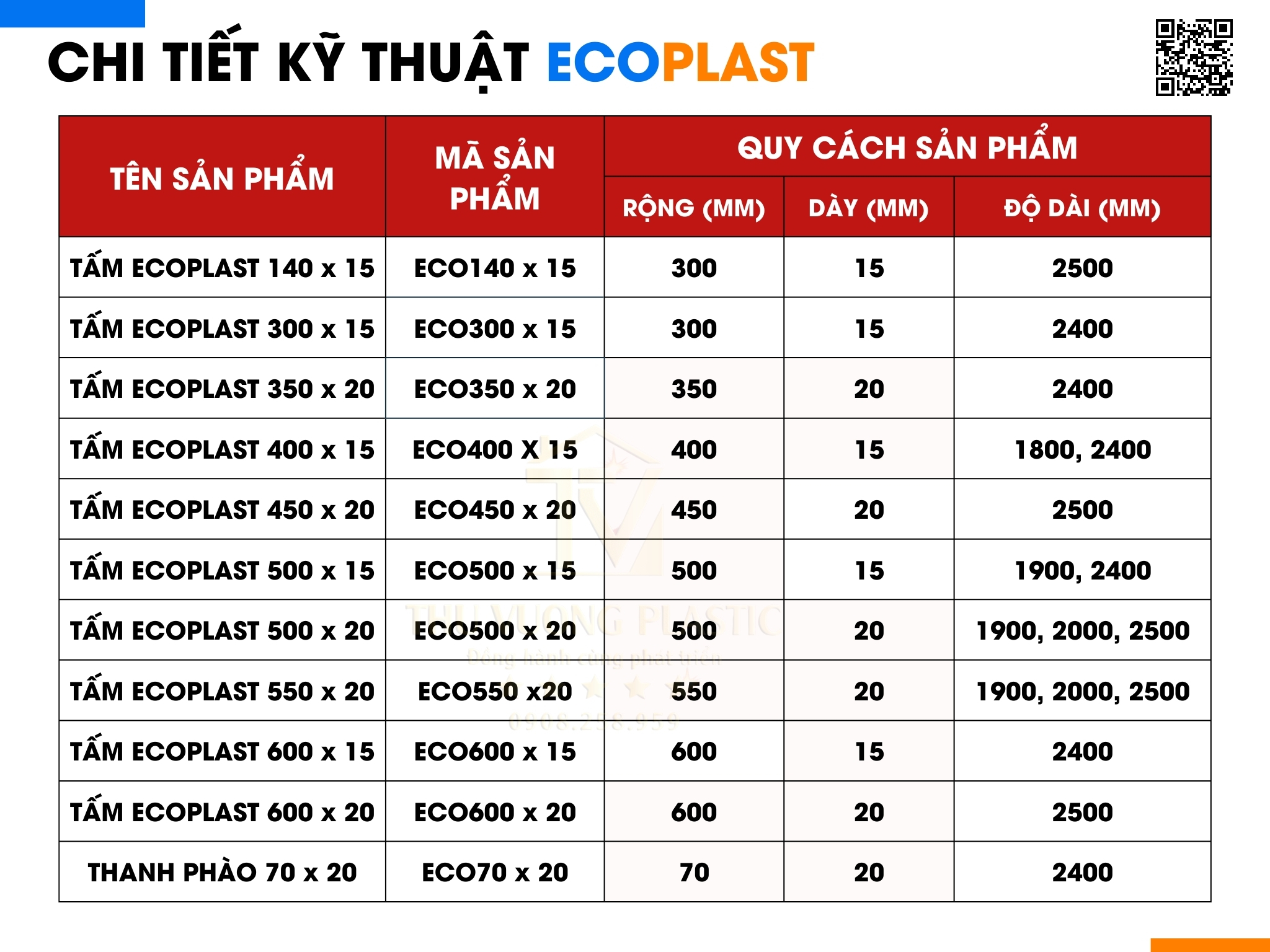 Bên cạnh đó là bảng chi tiết kỹ thuật về từng khổ tấm nhựa của dòng sản phẩm Ecoplast giúp các thợ thi công có thể dễ dàng tính toán và sắp xếp: